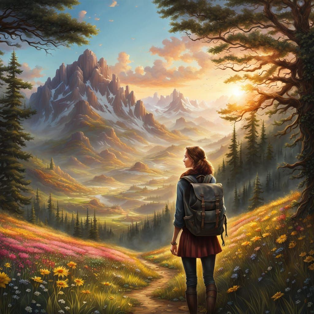 A realistic digital painting depicts a blonde backpacker in a mountain field with blooming wildflowers during golden hour. Cinematic lighting enhances this detailed, vibrant fantasy art scene.