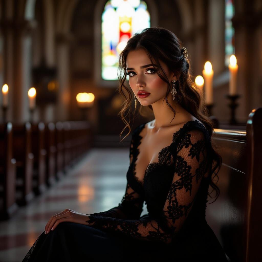 A photorealistic image of a woman in a black lace dress in an ancient church, illuminated by candlelight. Captures a mood of sadness and mourning with dramatic, emotive lighting.