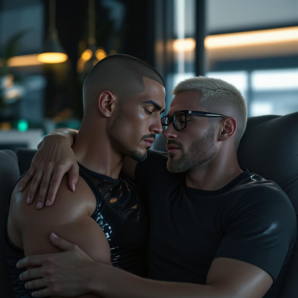 This image captures a tender moment between two men in a luxurious, futuristic living room, rendered in stunning 3D anime-inspired detail with hyperrealistic lighting and breathtaking clarity.