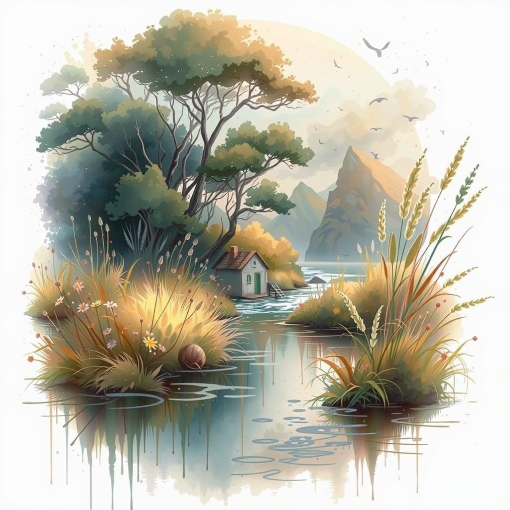 A watercolor painting of a solitary Irish cottage nestled in a vibrant green valley. The artwork captures a dreamy aesthetic with swirling gouache details, evoking a sense of serene isolation near a rugged coastline.