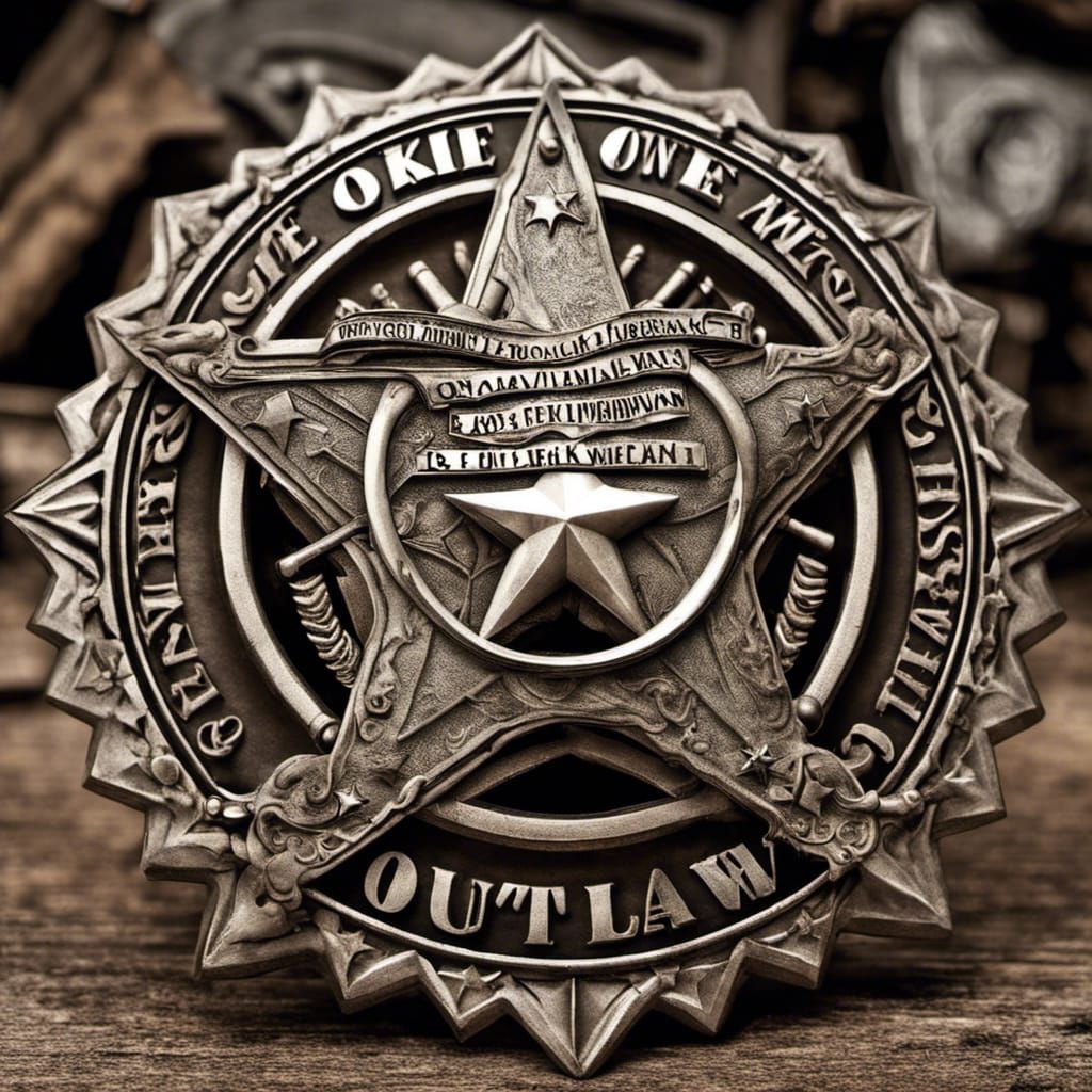 A hyperrealistic image showing a star badge with the text "Okie Outlaw" inside, shadowed by the Second Amendment. The badge features intricate details and a moody, atmospheric feel.