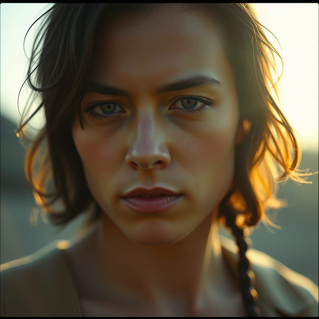 This image presents a cinematic still with film grain and a vignette, enhanced by meticulous color grading. The lighting and post-processing create a dramatic, atmospheric live-action scene with a 35mm aesthetic.