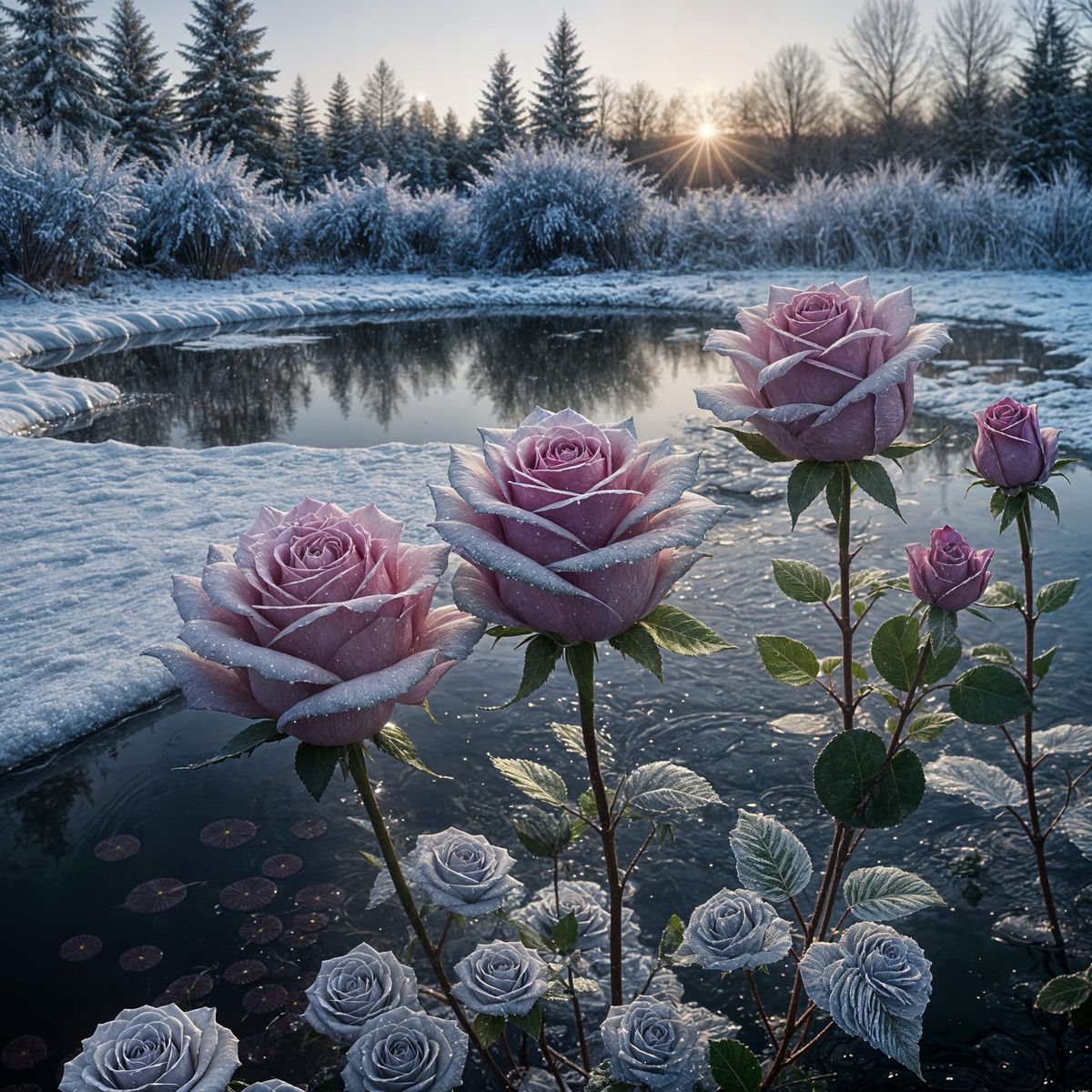 This image shows frozen roses emerging from a pond. The cinematic lighting highlights the intricate details of the ice formations and the delicate beauty of the frozen flowers.