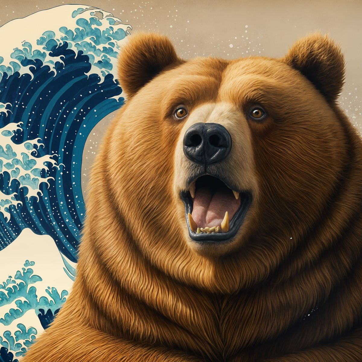 This image shows an obese Kodiak bear surfing a wave. The background evokes the style of Japanese ukiyo-e woodblock prints, featuring a dynamic seascape.