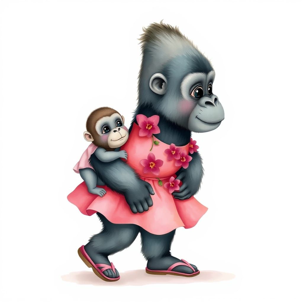 This image shows a whimsical gorilla mother in a pink dress with flowers, carrying her baby on her back. Rendered in a dreamy watercolor style, the illustration evokes a lighthearted, transparent scene.