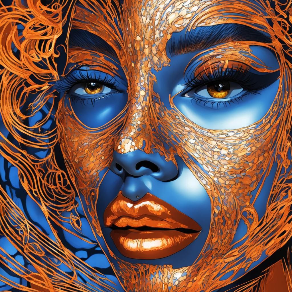 A captivating close-up of a radiant young woman with striking eyes and dark skin, bathed in orange light. This image showcases an art nouveau style with a blue color palette.