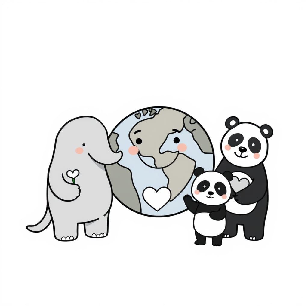 A black and white image of friendly cartoon animals encircling a smiling Earth. The animals are holding flowers and leaves in a simple, bold-outlined style.