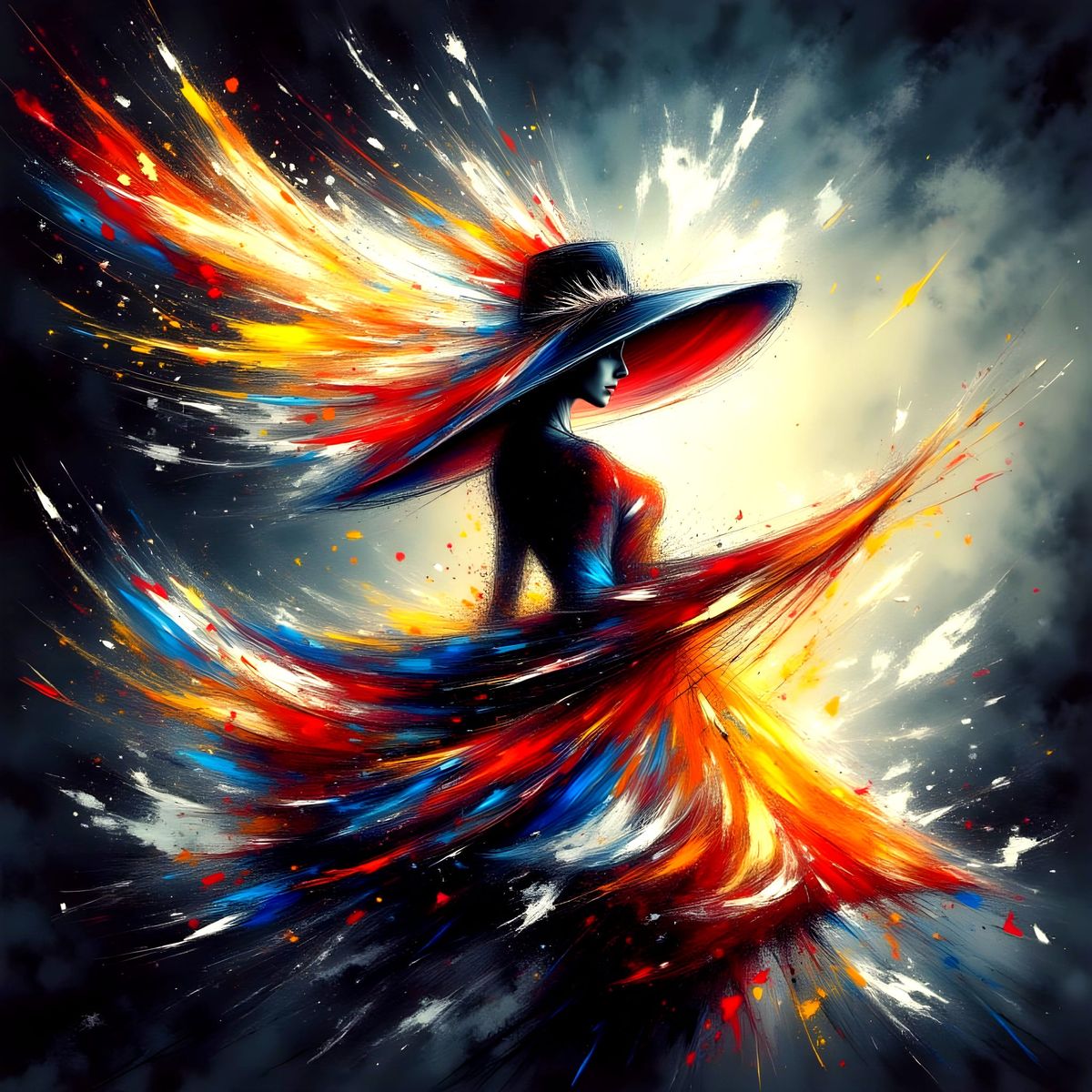 This image features a full body line drawing of a woman in a minimalist style, wearing a striking red hat. Created with expressive brushstrokes and vibrant colors against a deep black background.