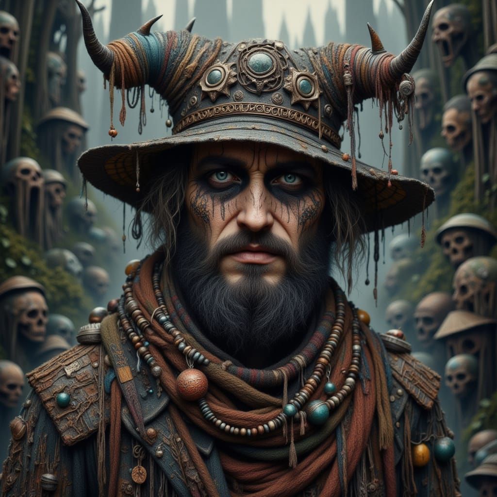 This image depicts a young man with a sly grin surrounded by eclectic, handmade textiles, standing before a crumbling, overgrown building with vines and moss. The artwork combines elements of dark fantasy and decay, reminiscent of a mystical, post-apocalyptic world.