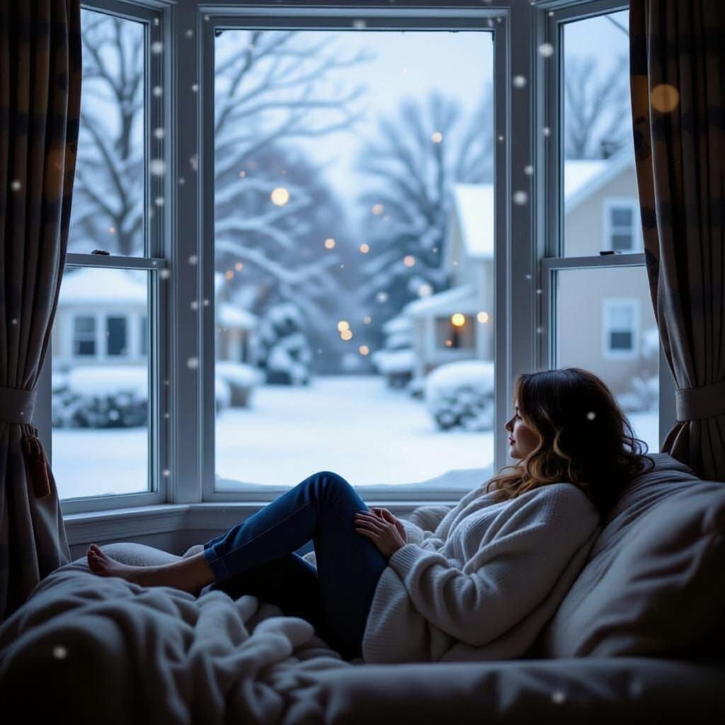 A 40 something woman curled up in a very outdated nostalgic 80s/1990s home sitting on a couch looking out a big bay window with outdated curtains and watching snow fall down of a middle America neighborhood. Not particularly cozy just more depressing looking
