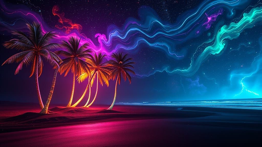 A fantastical beach scene featuring massive palm trees on a black sand island. The image is filled with neon rainbow sparkles, set against a cosmic backdrop in an atmospheric alcohol ink style.