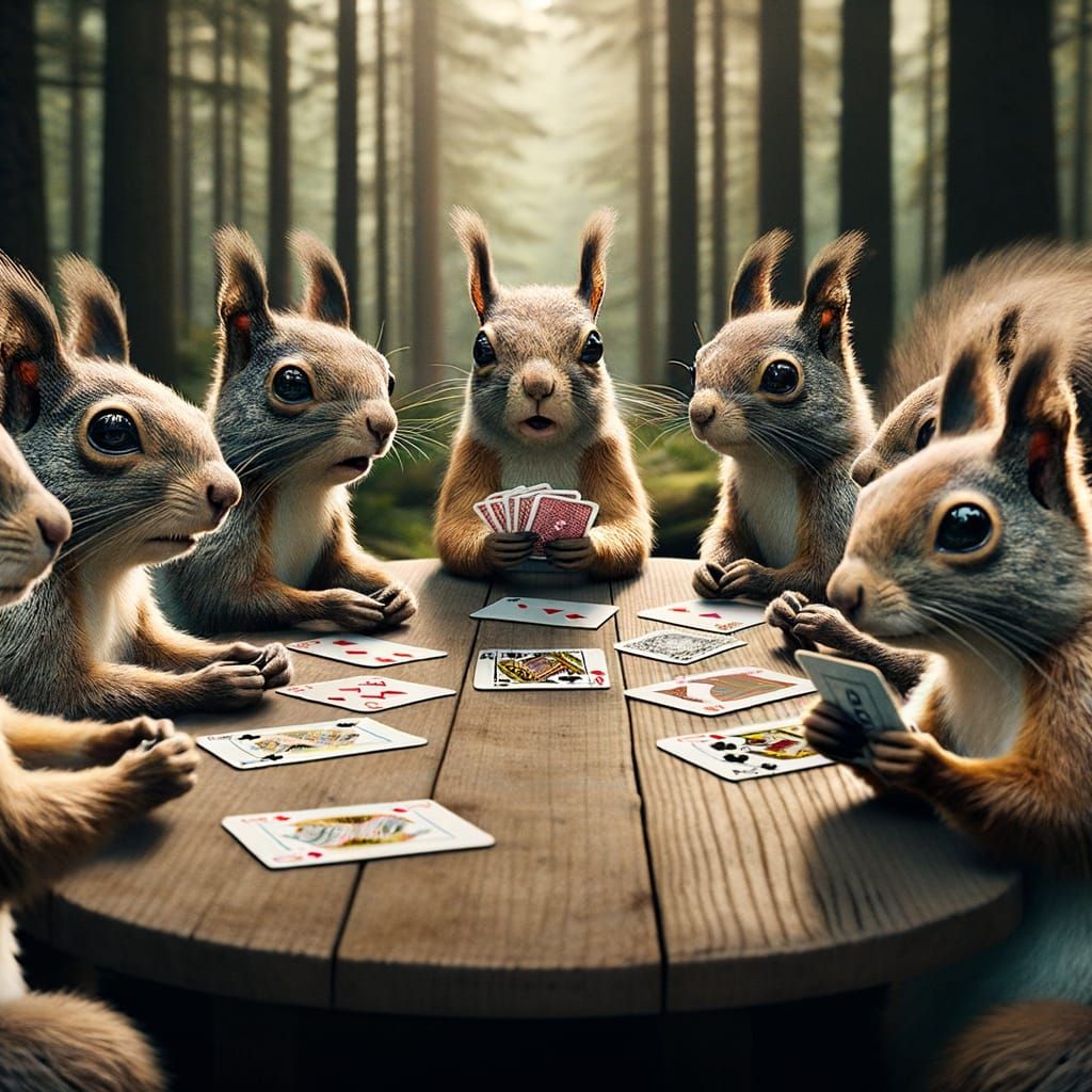 This image shows a group of expressive squirrels in a forest, playing a game of poker with cards displaying the letters DR. The scene is reminiscent of a movie, with the squirrels' emotions and tiny paws adding to the whimsy.