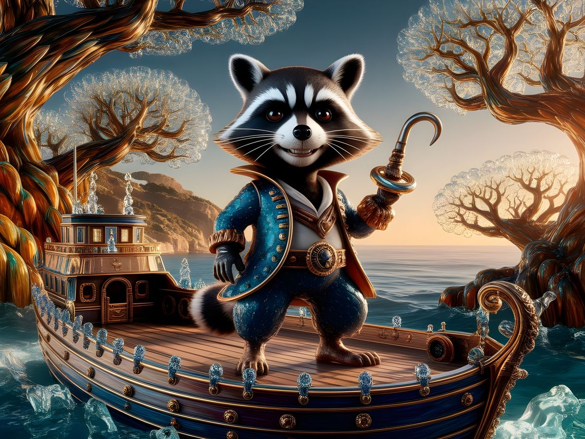 This image shows a glass diorama with a raccoon pirate on a glass ship. The raccoon, in pirate attire, stands on the deck, overlooking a glass forest in a detailed, sunlit scene.
