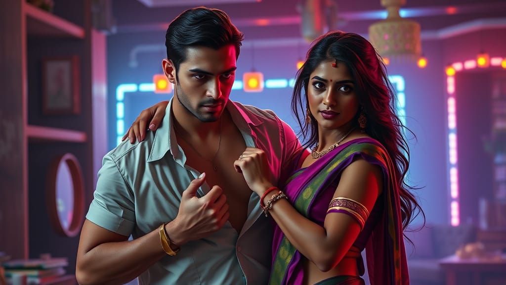 A dramatic scene of a man and woman in a fierce, intimate moment amidst a neon-lit loft. The woman's saree is partially torn, and the atmosphere is charged with passion.