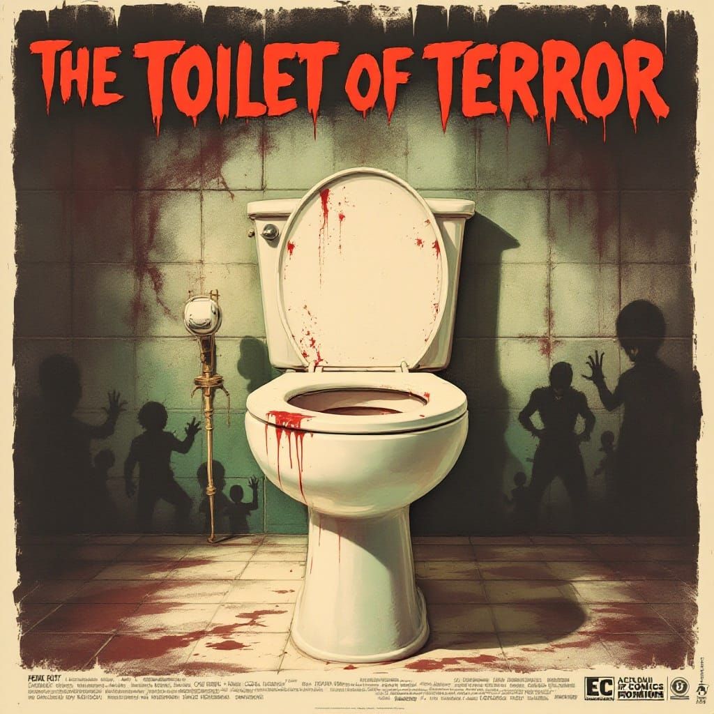 This retro horror poster features a toilet as the centerpiece, surrounded by eerie shadows and sinister silhouettes, with bold fonts and vibrant colors evoking a sense of foreboding dread, reminiscent of classic pulp horror and EC Comics.