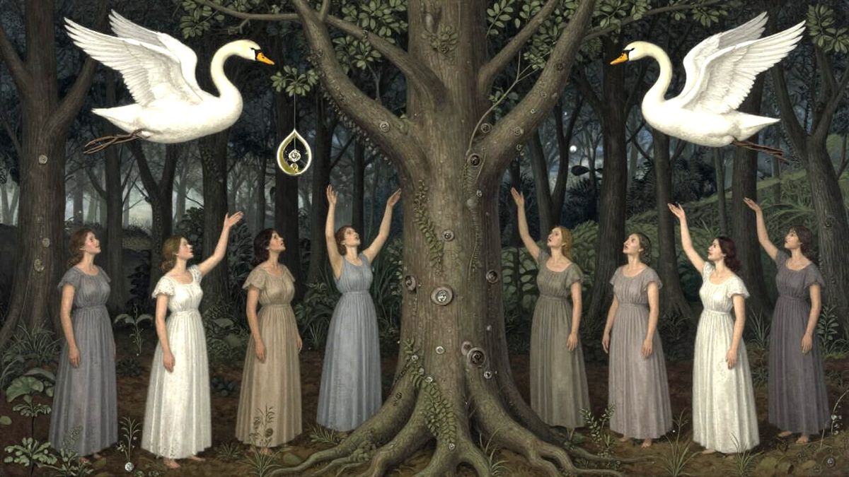 This image depicts women embodying the spirits of seals and swans, navigating a dark forest to build a community with its inhabitants, inspired by nature's resilience and growth.