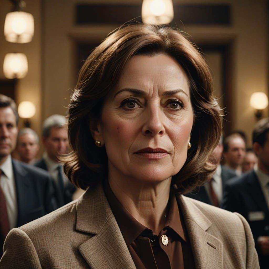 This image shows a hyperrealistic close-up of a middle-aged female Prime Minister. The portrait features soft, natural lighting and warm, earthy tones with a cinematic, film-like aesthetic.