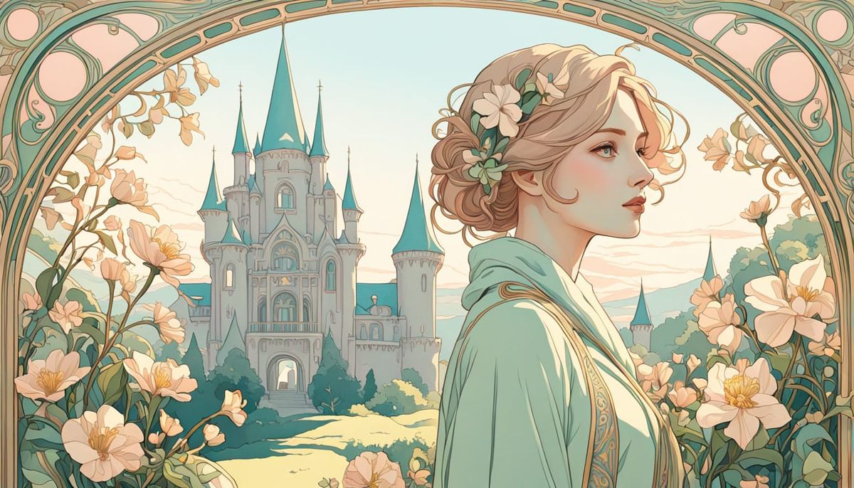 This enchanting image depicts a young woman standing before a majestic stone castle, surrounded by delicate Art Nouveau ornaments and vibrant, pastel colors, evoking a sense of serenity and whimsy.