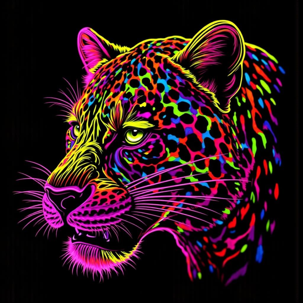 This image features a vibrant leopard pattern in hot pink and neon green against black. It has a glowing, energetic feel, rendered in a bold graphic art style.
