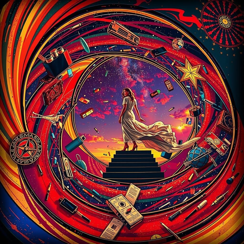 A striking picture of a woman in an Art Deco gown standing on a spiraling staircase. The hyperrealistic concept art features scattered objects and enigmatic symbols, with moody lighting and vivid color gradients.