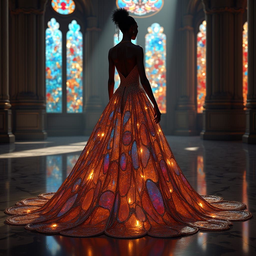 A fantasy African queen in a regal ballroom, adorned in an intricate gown of iridescent, stained-glass-like panels. Features ultrafine details and dramatic, cinematic lighting.