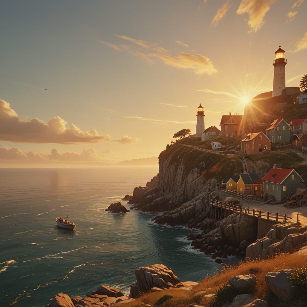 A vibrant oil painting of a coastal fishing village at sunset, featuring a lighthouse and stone chapel perched on a cliff. Golden light illuminates the rocky textures in this serene scene.