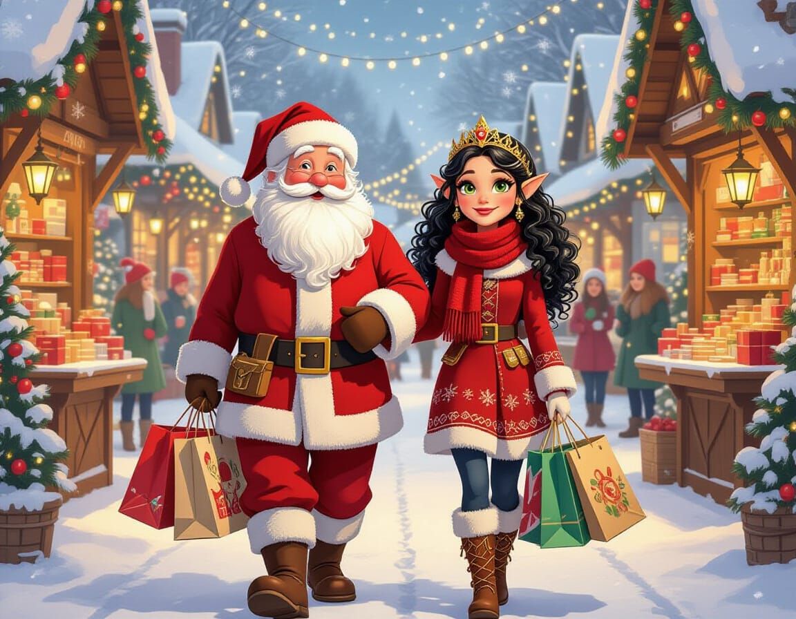 A heartwarming scene of Santa Claus and an elf friend shopping in a charming, snow-covered village marketplace. The image evokes a cozy, holiday-fantasy atmosphere with soft, glowing lights.