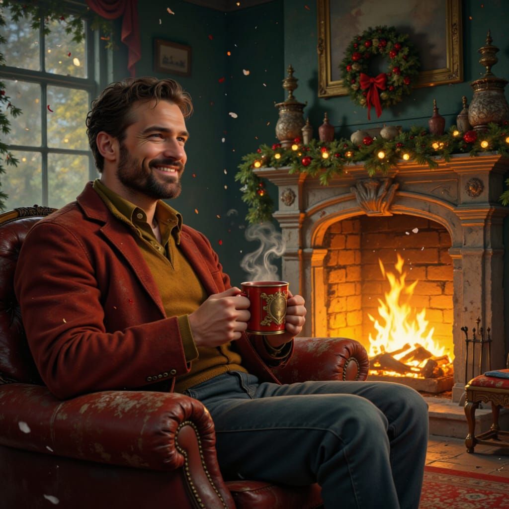 This image depicts a man enjoying hot chocolate by a festive fireplace, surrounded by Christmas decorations. The artwork is rich in detail and color, evoking a warm, joyful holiday atmosphere.