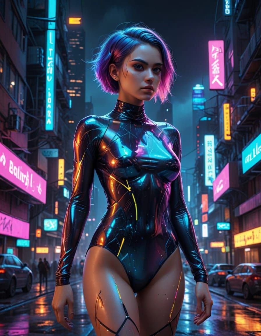 A striking photo of a confident woman with vibrant short hair in a futuristic city at dusk. She wears a metallic leotard and fishnet accents, illuminated by neon lights. The image features a detailed, realistic style with high contrast and vibrant colors.