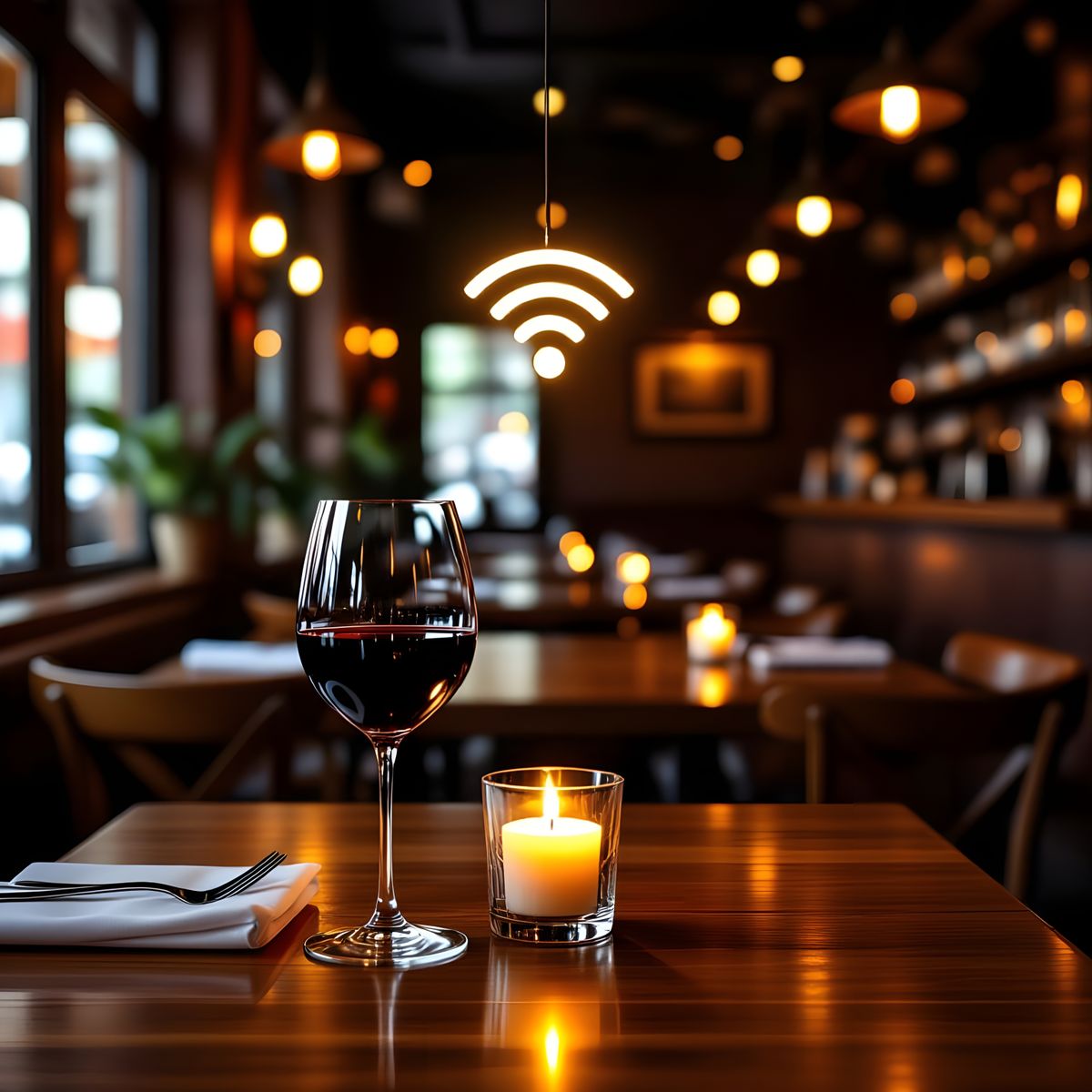 This photorealistic image shows a warm, inviting gastrobar with wooden tables, soft lighting, a glass of wine, and a candle. A glowing Wi-Fi symbol hovers above, enhancing the cozy atmosphere.
