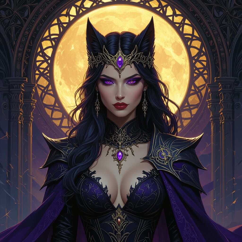 A dark fantasy masterpiece featuring a dragon queen, wolf pack, and owl under a blood moon. Intricately detailed concept art with dynamic lighting and deep colors.