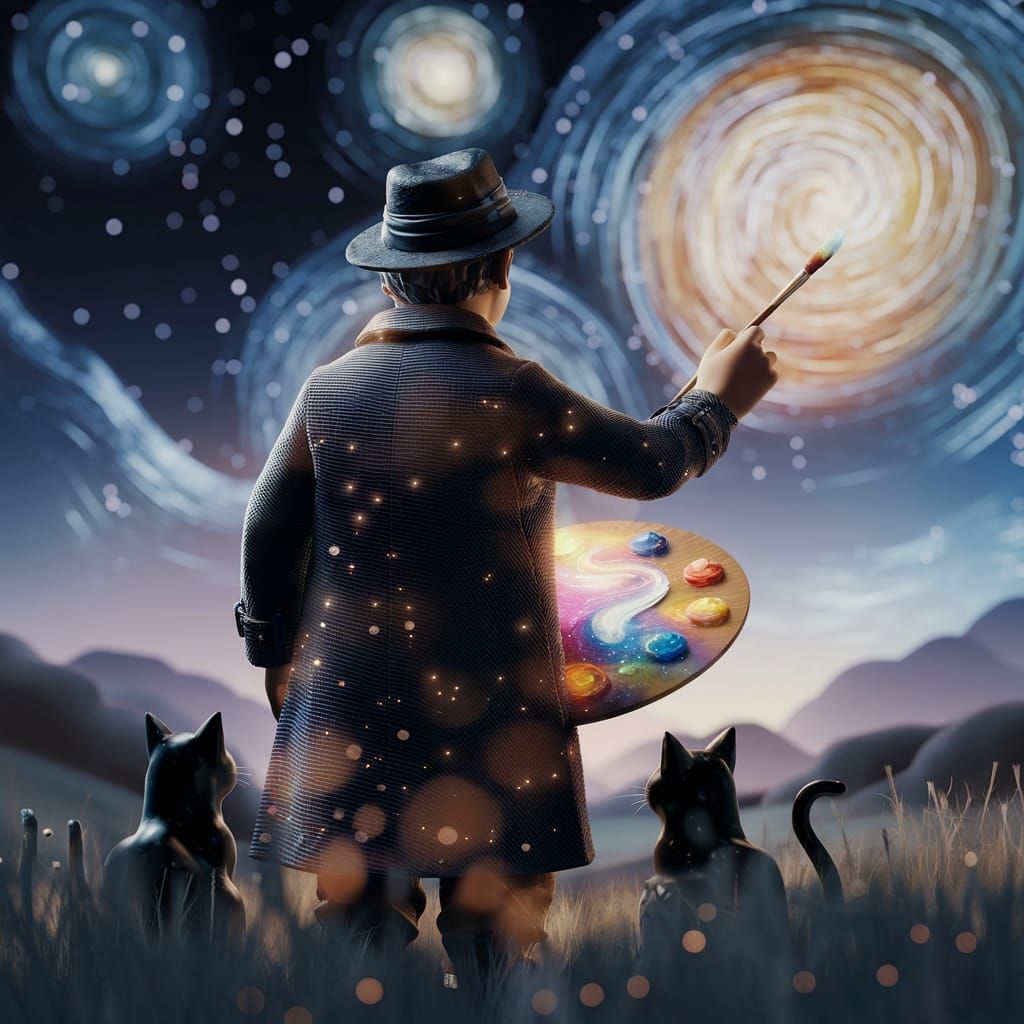 This 3D render captures a dreamlike scene of an artist painting a golden galaxy under a vivid starry night sky, with two black cats nearby. The artwork evokes an ethereal mood.