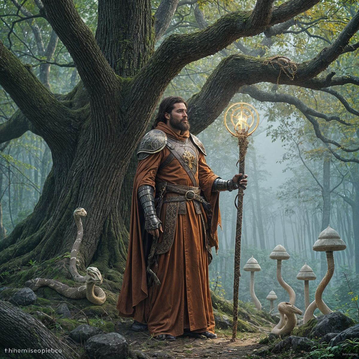 This image shows a serene cleric standing beneath a sprawling maple tree, surrounded by ethereal spirit guardians and adorned in intricately embroidered robes and heavy knights armor. Inspired by mystical landscapes and high-fantasy illustrations.