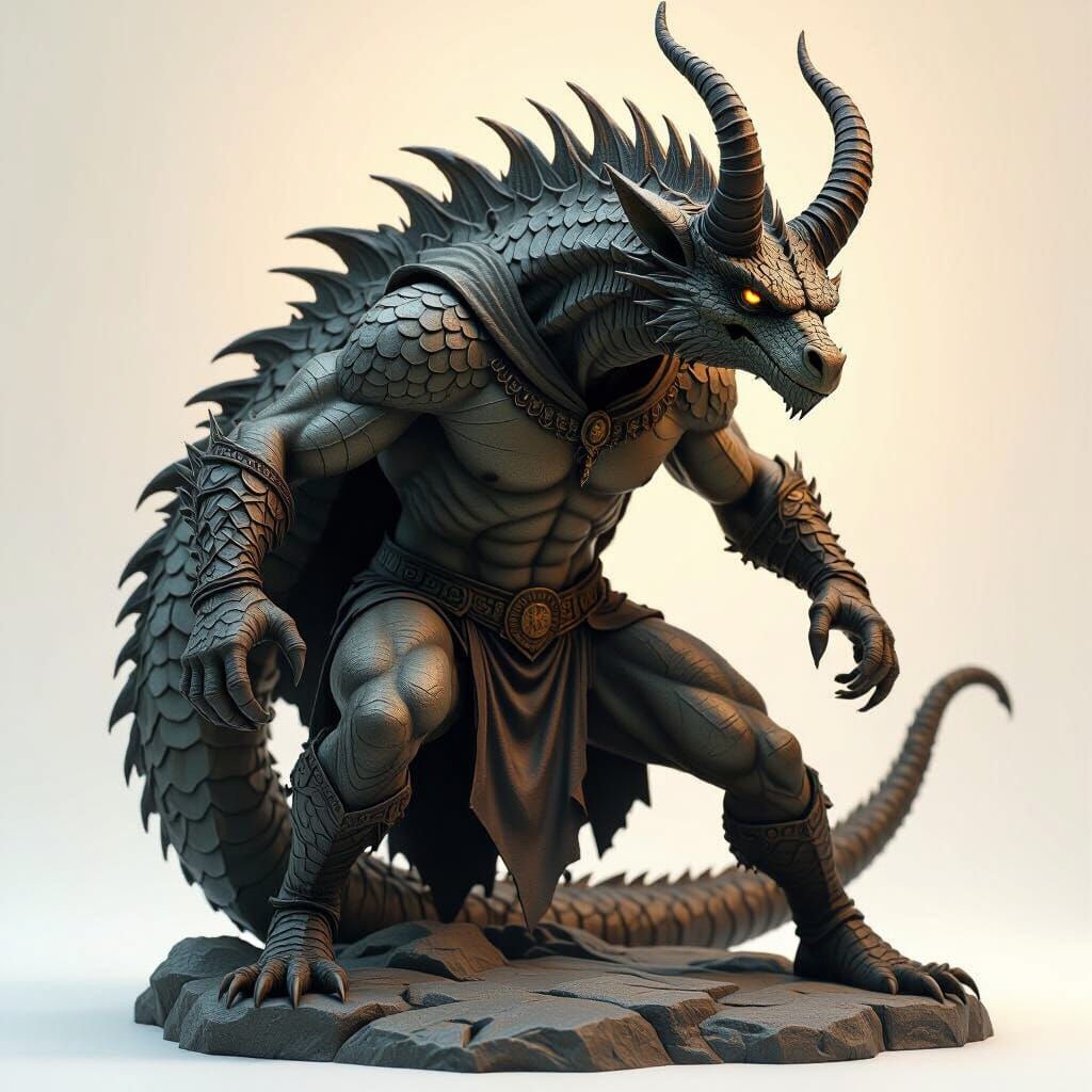 This 3D render depicts a formidable dragon-man in a defensive stance, featuring a horned, mystical head with reptilian eyes and a coiling tail. Rendered with dramatic lighting and vivid colors, it evokes a dark, intricate sculptural aesthetic.