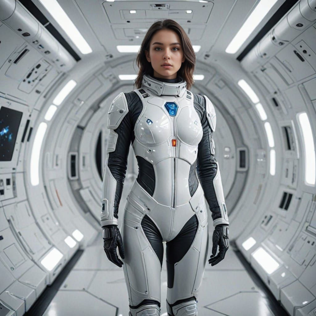 This image features a stunning astronaut woman in a sleek white spacesuit, posing dynamically against a futuristic spaceship backdrop. Her serene expression captures a moment of peace in space exploration.