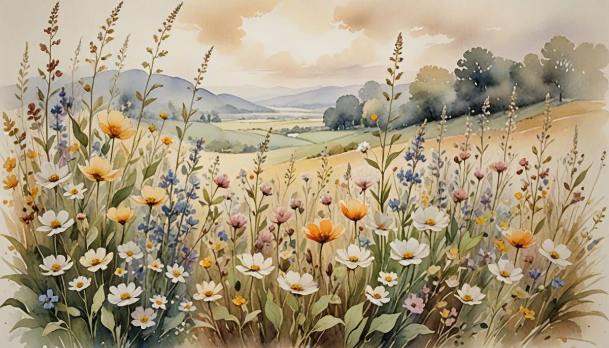 This serene watercolor illustration features a delicate row of wildflowers on a warm beige background, with soft brushstrokes and gentle textures evoking a peaceful, nature-inspired atmosphere