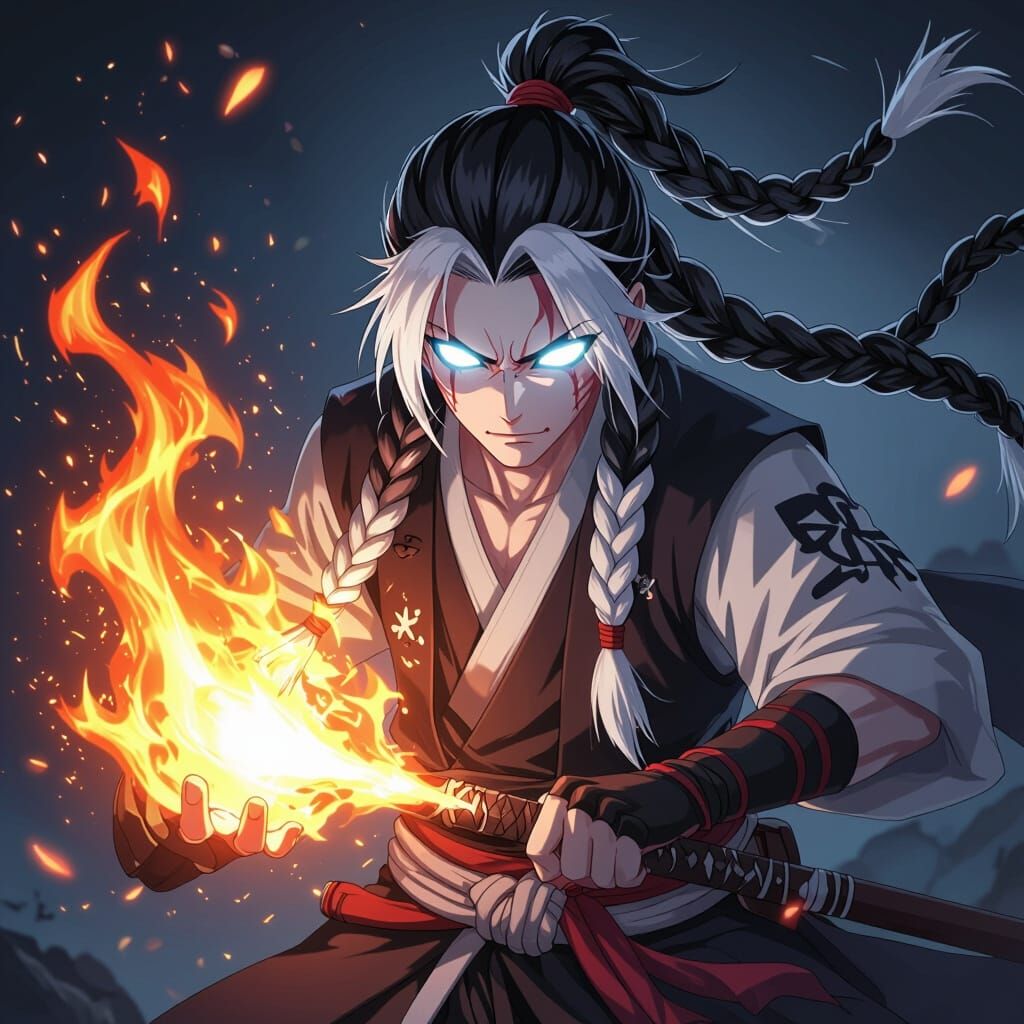 A striking picture of a male anime character with long braided black and white hair and glowing white eyes. He is dressed as an adventurer and appears to control fire, in a vibrant anime style.
