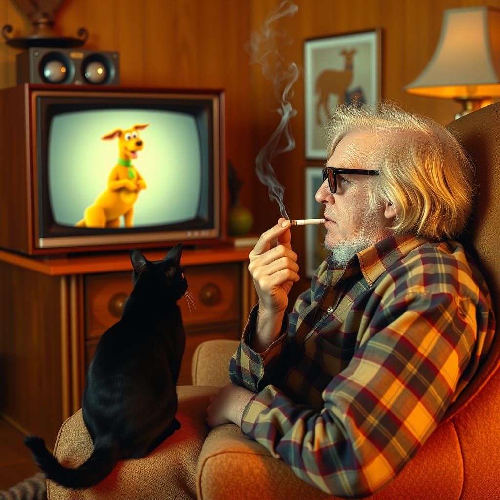 A cozy, nostalgic living room scene from the 1970s, featuring a warm, golden light and a gentleman watching Captain Kangaroo on an old TV, with a black cat by his side.