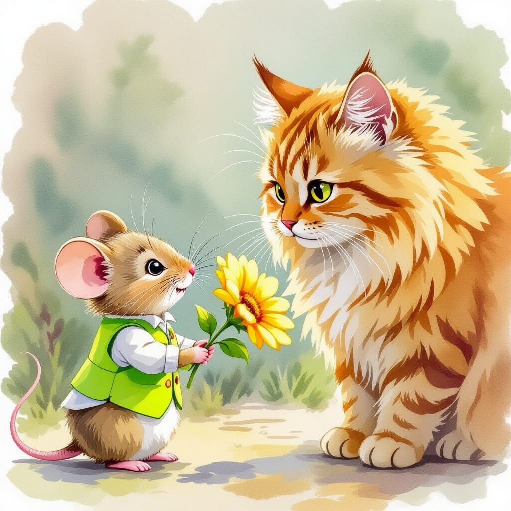 This image shows a tiny mouse in a green vest presenting a large yellow flower to a big cat. The scene is rendered in a playful watercolor style, reminiscent of classic children's book illustrations.