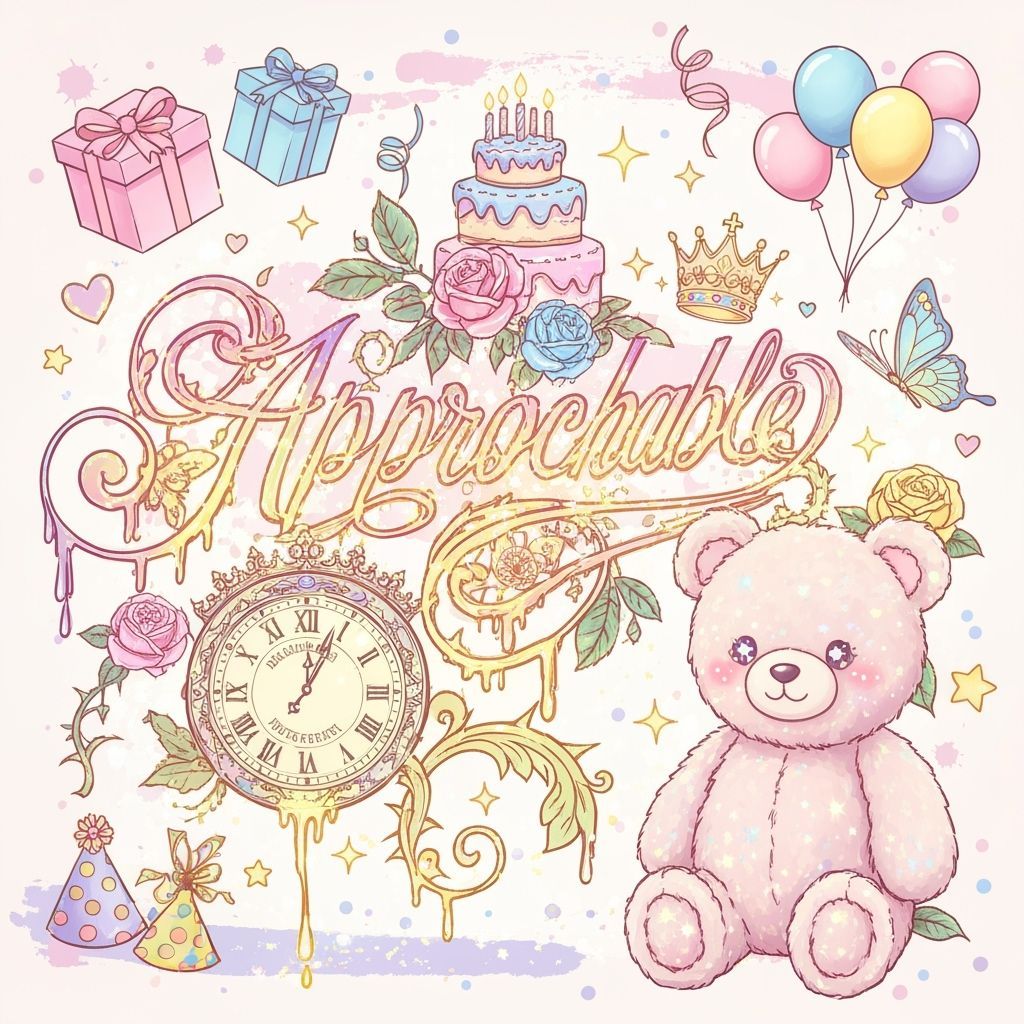 A whimsical and celebratory illustration with a gentle, pastel color palette. The word "Approachable" is featured in a sparkling, elegant script at the center. The design includes a variety of charming elements such as a three-tiered birthday cake, a fluffy pink teddy bear, pastel-colored balloons, and wrapped gift boxes. A vintage clock and soft roses are also part of the composition, giving it a dreamy, party-like atmosphere.
