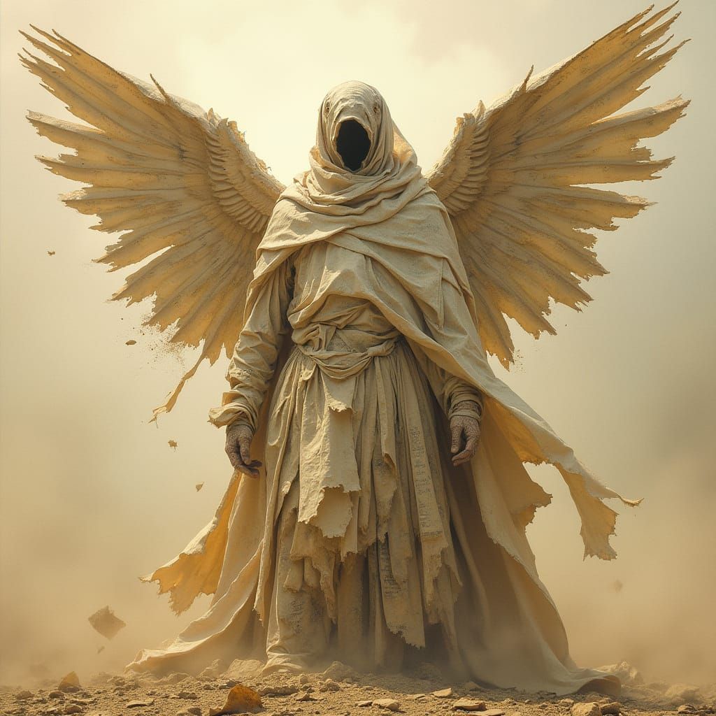 This image shows a towering figure made of layered parchment, its form shifting like woven pages. The figure has the texture of old manuscripts with sepia-toned stains and wings of vast, layered sheets. Dust surrounds him.