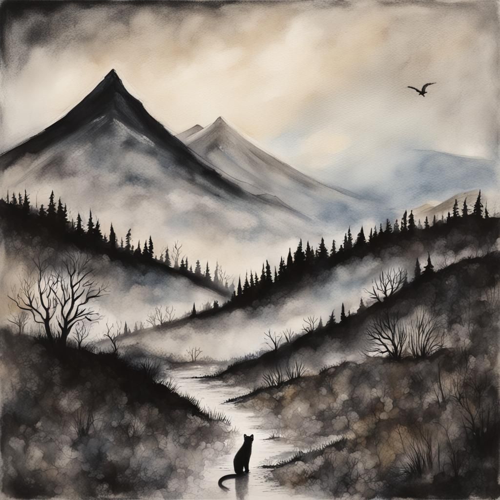 A surreal image of a steampunk ferret on a moor at night. Long shadows and mist fill the air, with a distant mountain in view. The artwork is in a Tim Burton-esque style.
