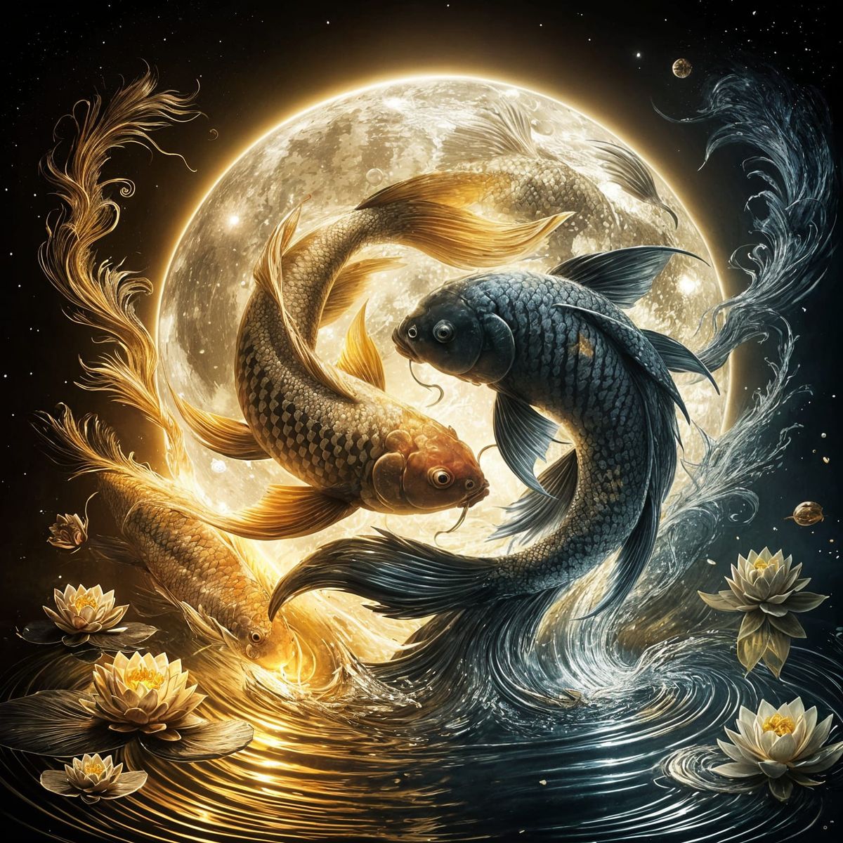 This captivating artwork portrays the timeless symbol of yin and yang through the elegant dance of two koi fish—one shimmering with warm golden hues and the other enveloped in cool, dark shades. Their intertwined bodies form a harmonious circle that reflects the interconnectedness and balance of opposing forces in nature. The luminous full moon in the background enhances the mystical ambiance, while the surrounding water lilies add tranquility and grace to the scene. Together, these elements express the philosophy that duality—light and dark, soft and strong, calm and dynamic—is essential for the unity and harmony of the whole.
