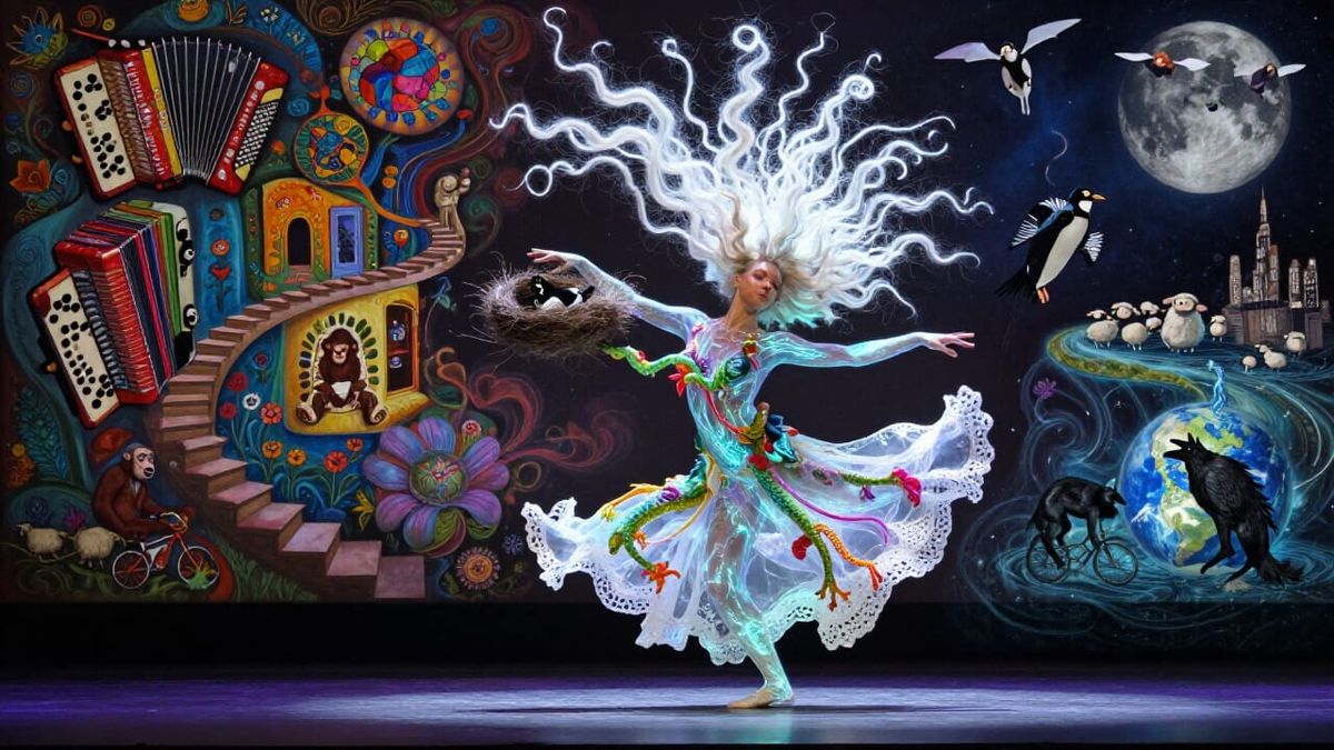 This image shows a dancer in a unique lace lizards dress, with hair transforming into a white cascade. Psychedelic art style with energetic movement and abstract patterns.