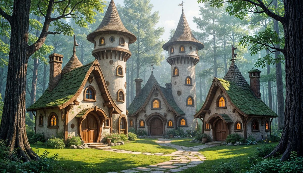 This image showcases three unusual, magical elven cottages with castle-like round towers, nestled deep within an enchanted forest setting.