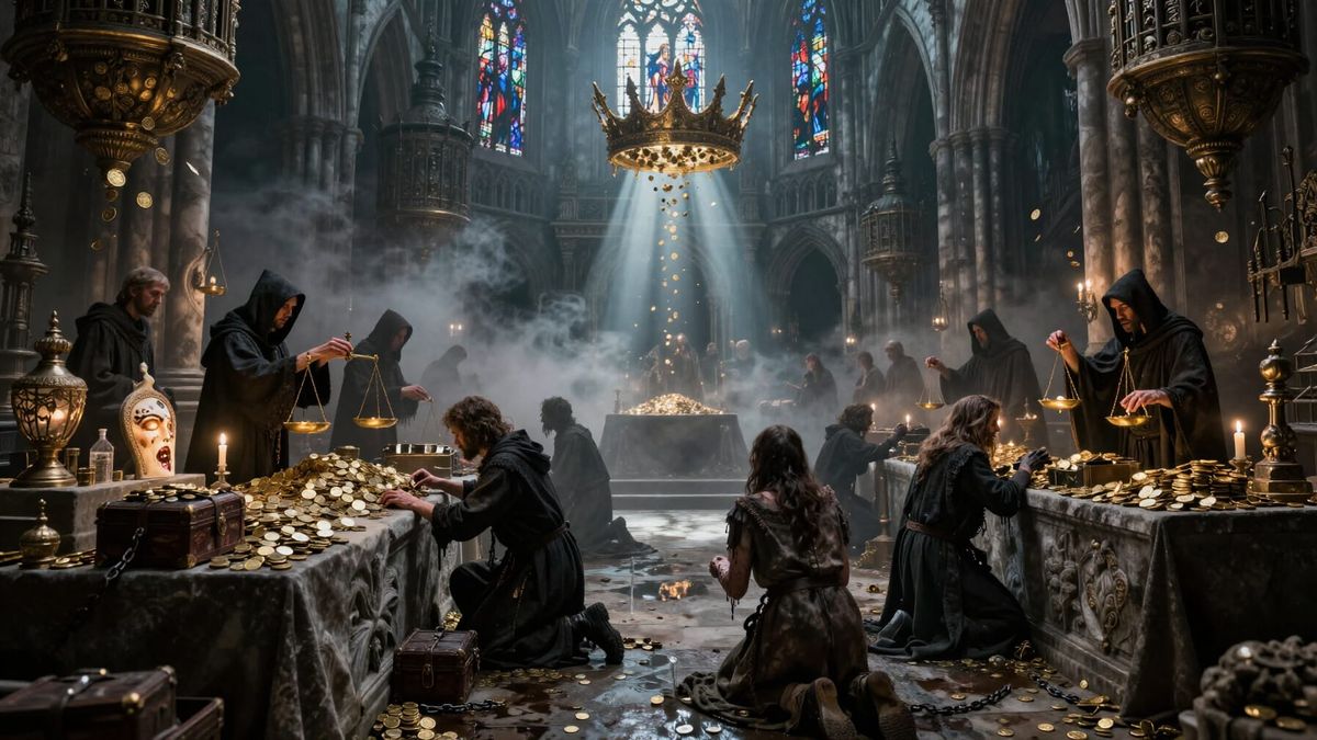 This image depicts a hyper-detailed, ultra-realistic cinematic scene of a dystopian medieval cathedral turned into a nightmarish marketplace. Clergy-bankers trade guilt and fear for gold, while ordinary people offer their last coins.