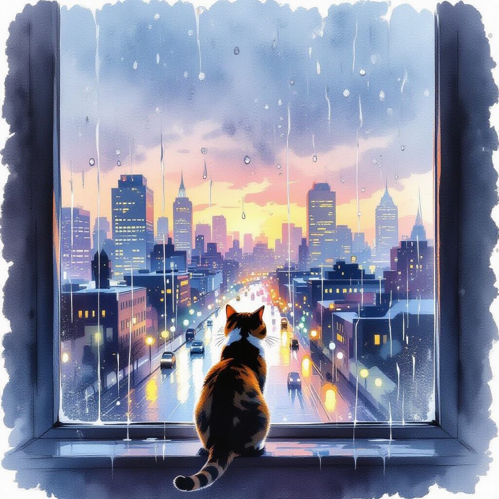 This image shows a tabby cat on a window ledge, gazing at a rain-streaked cityscape at dusk. Water droplets create abstract patterns on the glass, with soft colors and painterly brushstrokes.