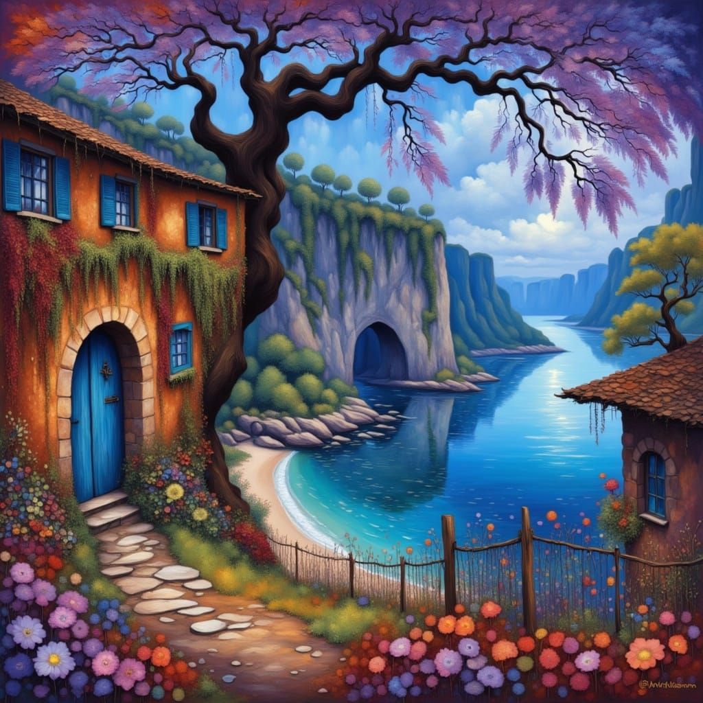 Easily generate your own impressionist paintings, like this coastal town scene, with our free AI art tool.