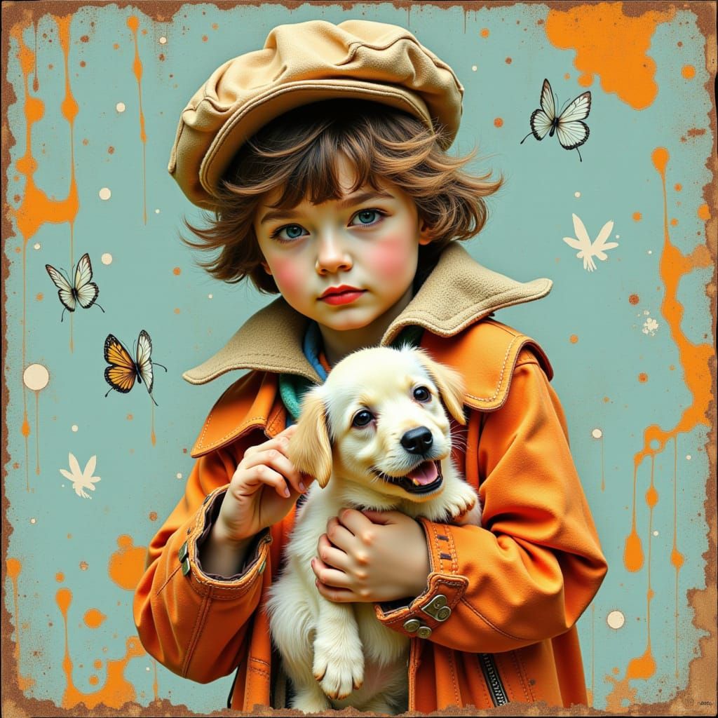 <lora:Organic-Grunge:1.0> Vintage art, orange and teal hues, sunny day, little boy baker boy cap with white puppy, textured clothing, splash art, in style of Dante Gabriel Rossetti, Yossi Kotler, Camilla D'Errico, masterpiece, fine art in style of Carne Griffiths, Paula Hoppe
