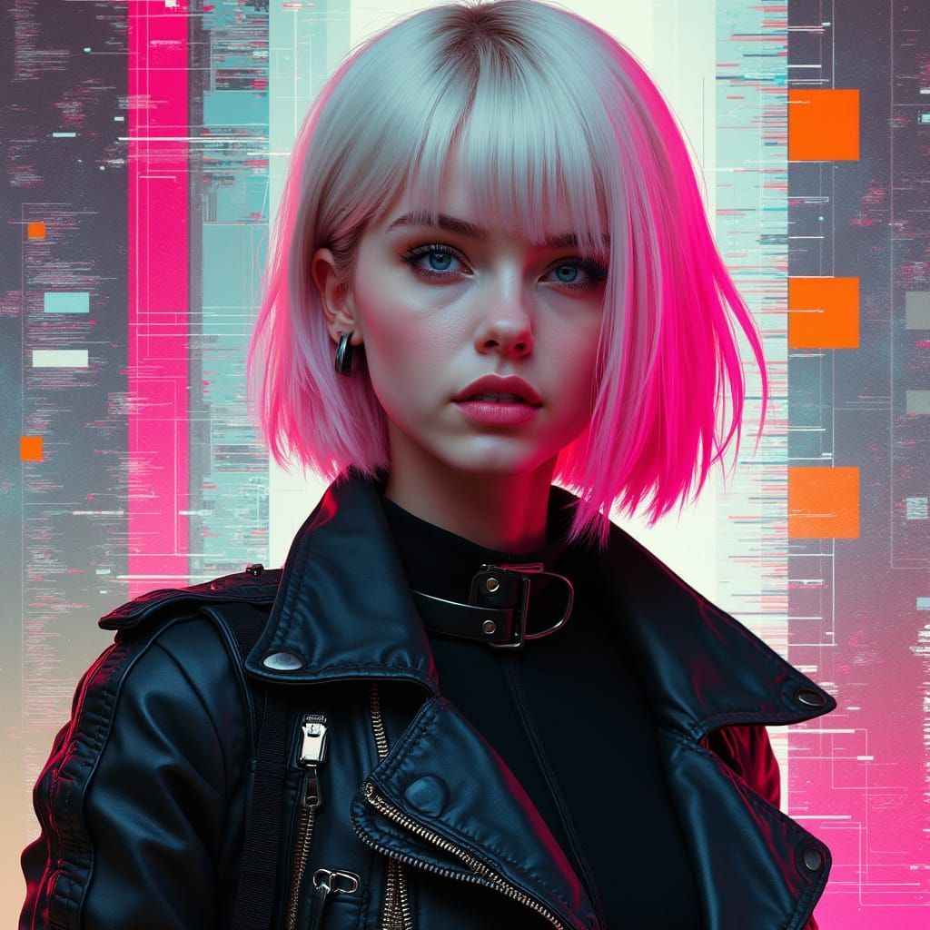 A digital portrait of a woman with a platinum bob and pink streaks, set against a glitch art backdrop. The image captures a cyberpunk aesthetic with geometric patterns and neon highlights.